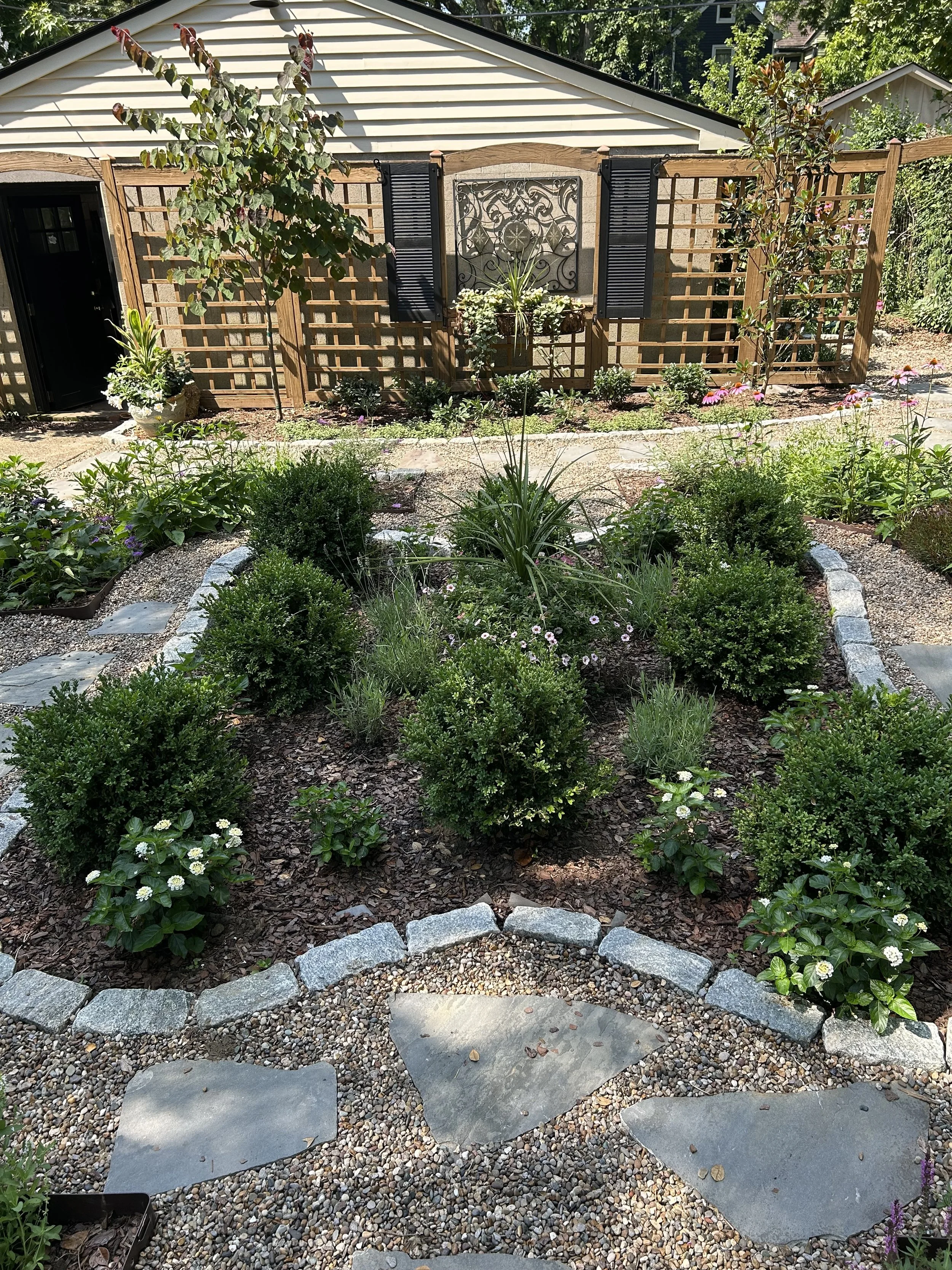 An unused lawn reimagined as a gardener's dream with deliberate geometry and symmetry.